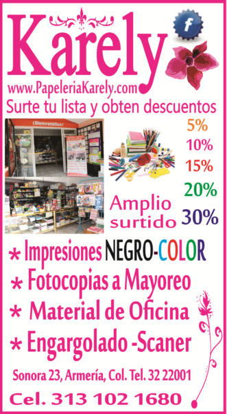 Descuentos y promociones en Papelería Karely - Estamos a sus ordenes Tel. 313 32 2 2001